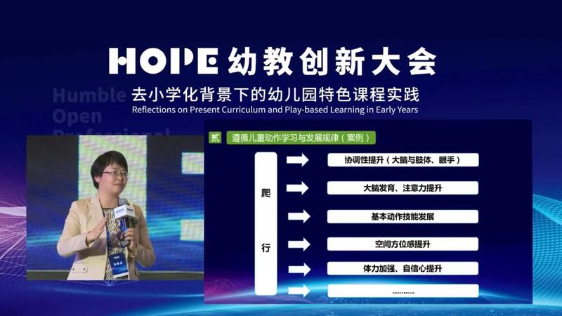 通过对课程开发理念、理论依据、设计思路、目标体系、顶层设计以及内容架构等不同层面系统的介绍,以“幼儿爬行动作学习”为案例,提出在幼儿时期基本动作技能的学习与发展,将会对幼儿今后的大脑发育、注意力提升、运动能力,空间方位感等素质的提升等有明显的促进作用。结合汪晓赞教授自身的育儿经验与视频记录,生动地阐述了课程开发过程中经历的点点滴滴,受到了与会者们的肯定与关注,掌声不断。