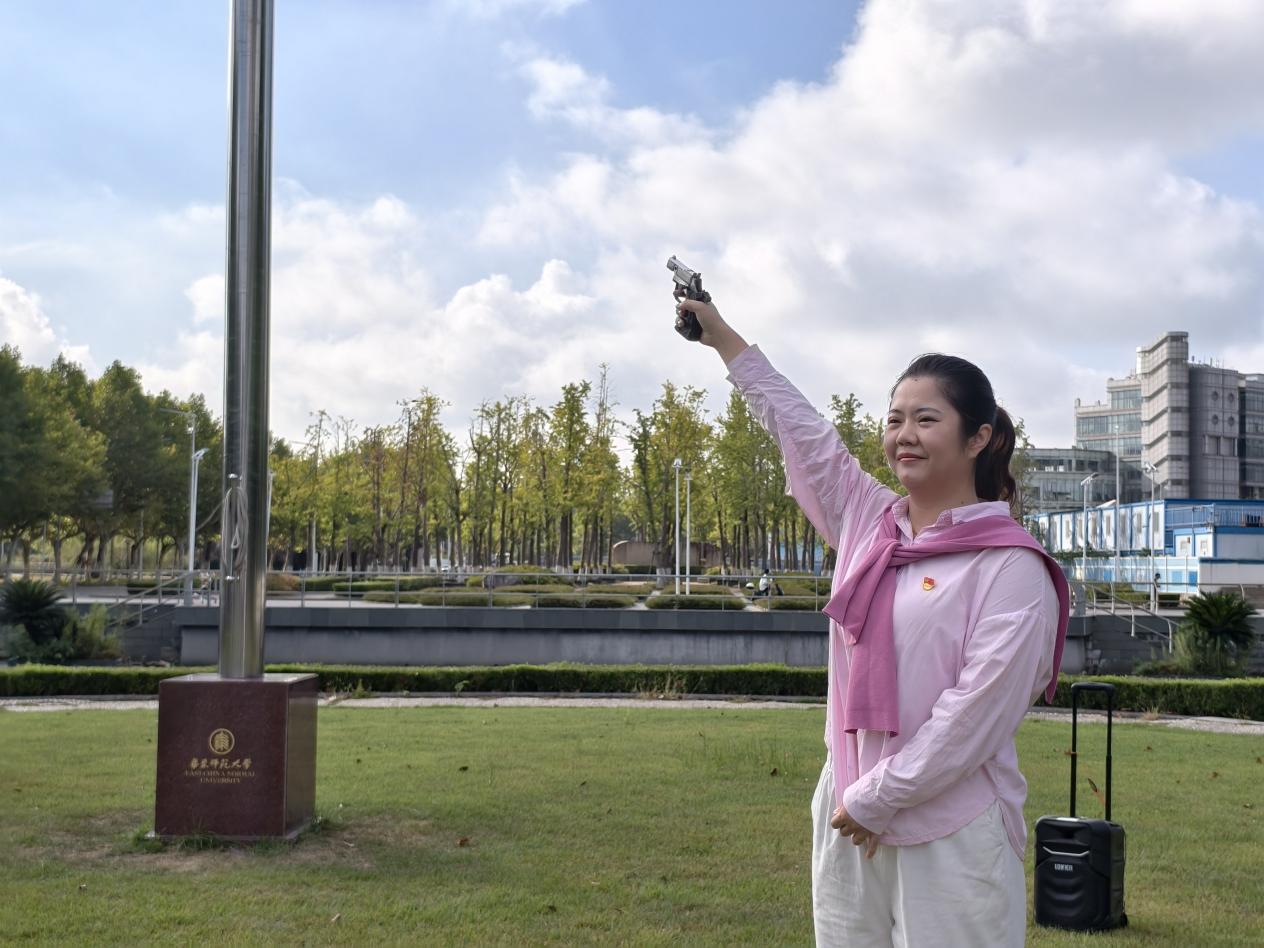 活动终点设在浦江第一湾公园。完成全程的参跑者在主题横幅上写下对祖国的祝福与个人的奋斗誓言。活动尾声,一场精心策划的“快闪”合唱《我和我的祖国》将现场气氛推向高潮。领唱同学从人群中缓缓走出,深情开嗓。不经意间,熟悉的旋律从天桥、从广场、从绿荫处悠然响起,最终汇聚成全场激昂的大合唱。这意外的惊喜让所有人心潮澎湃,挥舞的国旗与动人的旋律交织,既是深情的礼赞,也是奋进的誓言,更是华东师大人对祖国母亲的深情告白。