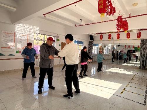 针对年龄较长的学员,刘韵诚带领大家练习八段锦。在学员已有基础上,重点进行动作纠偏与内涵讲解——从“双手托天理三焦”的呼吸配合,到“五劳七伤往后瞧”的发力要领,逐一细致指导,同时阐释每一式的养生功效,让学员在舒展身心的同时,深入感受传统养生文化的精髓。