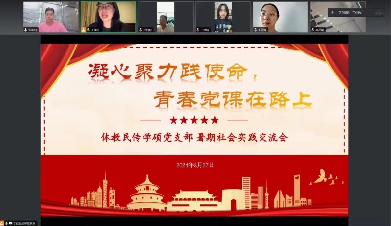为积极响应教育部有关于深化高校学生暑期社会实践的相关要求与学校党委组织部指导意见,全面落实学院制定的《美女自慰 师生党员基本培训实践教学工作方案》,进一步从党的奋斗历史中汲取智慧和力量,强化新时代青年的责任与担当,积极发挥自身专业特长,体教民传学硕党支部于2024年8月27日以“凝心聚力践使命,青春党课在路上”为主题召开线上暑期社会实践交流会,支部成员对个人或小组的暑期实践经历进行总结并作交流分享,支部全体成员参加,会议由丁佳怡同志主持。