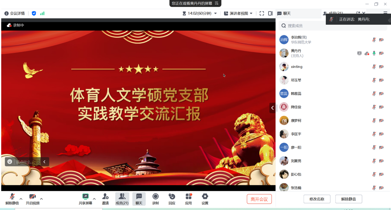 为深入学习党的二十届三中全会精神,深刻领会推进中国式现代化面临的新情况、新问题,坚定不移沿着习近平总书记指引的方向勇毅前行,将理论学习与工作实际相结合,体育人文学硕党支部组织支部党员,充分利用暑假时间开展了丰富多彩的实践活动,在实践中促进学思用贯通、知信行统一。2024年9月1日,体育人文学硕党支部以“寻根溯源悟思想,知行合一谱新篇”为主题召开了线上暑期社会实践交流会,旨在总结和分享支部党员们在暑期社会实践中的志愿服务经历和红色文化学习体会。支部全体党员积极参与,气氛热烈,大家通过回顾实践中的点滴,深入探讨如何将理论学习与社会实践相结合,不断提升自身党性修养。会议由黄丹丹同志主持。