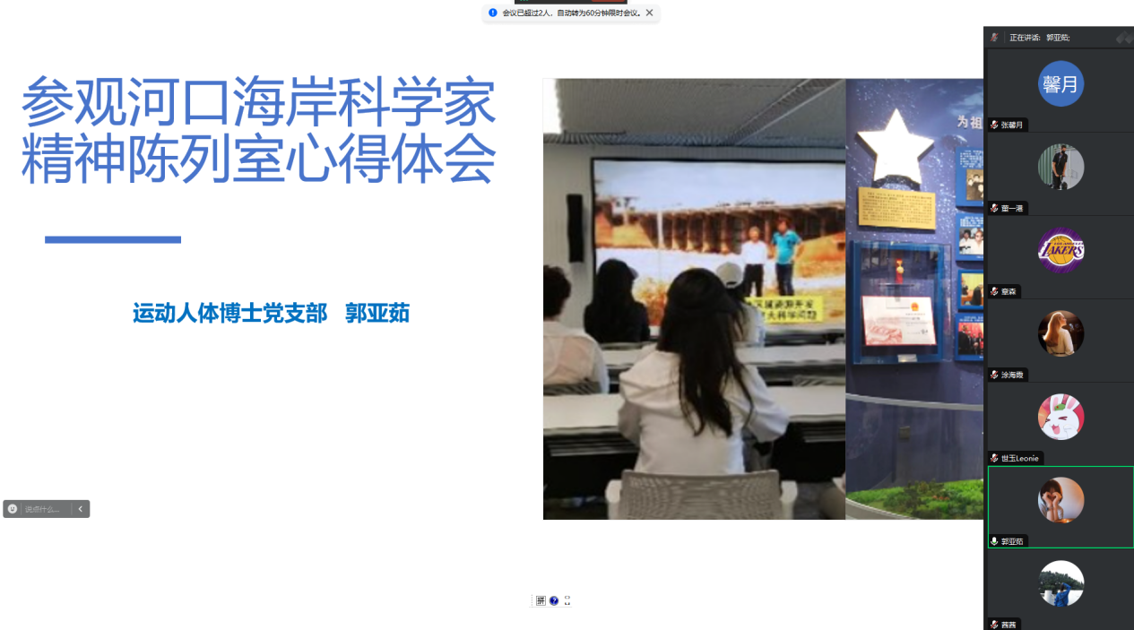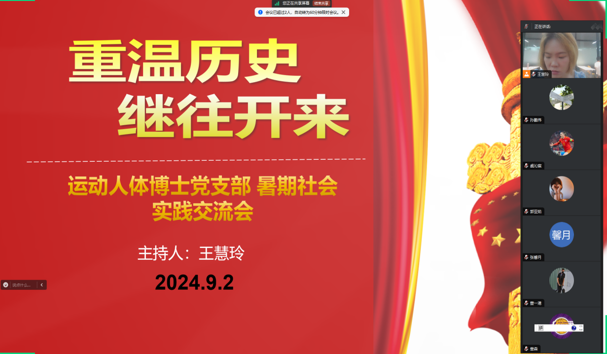 为积极响应教育部有关于深化高校学生暑期社会实践的相关要求与学校党委组织部指导意见,全面落实学院制定的《美女自慰 师生党员基本培训实践教学工作方案》,进一步了解党的艰辛历程、光荣传统、宝贵经验和伟大成就,继承弘扬伟大建党精神,运动人体博士党支部于2024年9月2日以“重温历史,继往开来”为主题召开线上暑期社会实践交流会,支部党员对个人或小组的暑期实践经历进行总结并作交流分享,支部全体成员参加,会议由王慧玲同志主持。