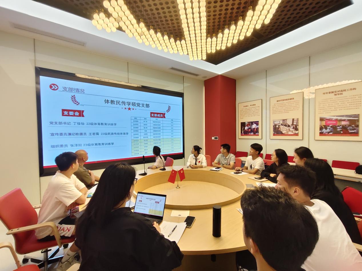 丁佳怡向与会师生们介绍了体教民传学硕党支部概况,并由组织委员带领大家分析了支部建设和发展党员工作的主要问题。杜舒书深入调研了支部常规工作及特色党建活动开展情况,并为党员同志们分享了一则毕业生学长的故事,以此勉励大家在未来的学习工作中要“多思进取,拒绝功利”,切勿在行动前优先思考结果的优劣,而忽略了过程中的所得所获。袁春勉励全体党员,希望大家延续支部的特色亮点,齐心推动党建品牌建设,强调“领头雁”效应,促进党建带团建,充分发挥党员先锋模范作用。
