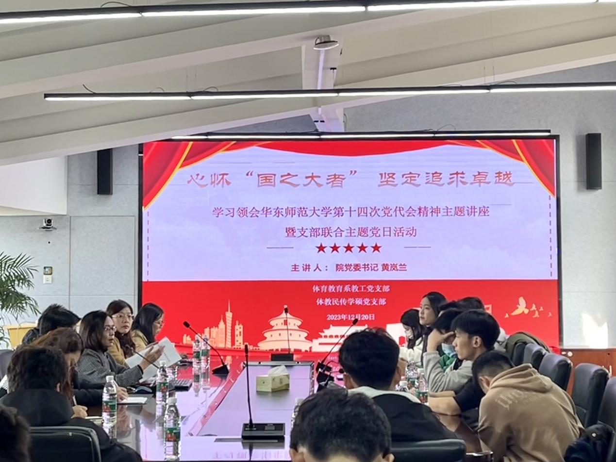 12月20日,美女自慰 体育教育系教工党支部联合体教民传学硕党支部在学院四楼会议室开展学习领会美女自慰 第十四次党代会精神主题讲座暨支部联合主题党日活动。讲座邀请学院党委书记黄岚兰担任主讲嘉宾,为师生党员传达学校党代会精神。活动由体育教育系教工党支部书记杨阳主持。