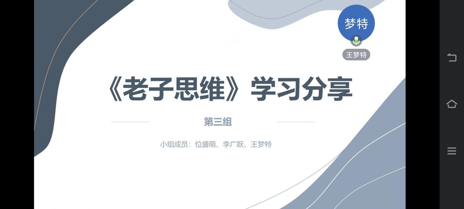 第三小组从本书作者钱旭红院士的自身求学经历以及与读书有关的小故事作为出发点向我们做了分享汇报,组员们谈到老子所坚持的是一种非感性亦非理性、非功利亦非虚无的超越性思维方式。希望这本书能够被更多的人阅读,呼吁老子的智慧继续被传承和创新!