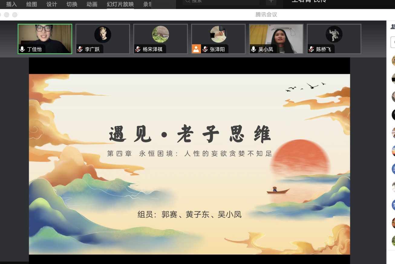 在《老子思维》的分享中,第二小组带领支部成员从品读伦理到以往鉴来,为我们介绍了此书所传达的经典思想,该小组还结合时下热点,通过个人对老子思维的感悟与理解剖析了最近很火的“春山学”热梗,成员们感悟道,我们应当注意学习老子思维,注重对自身修养修为的培养,学会精修内观,做自己的旁观者,也是我们作为党员的一种道德修养。