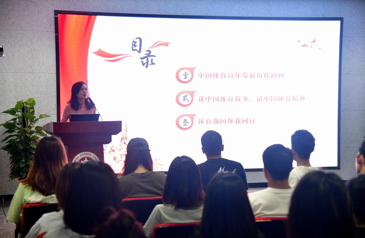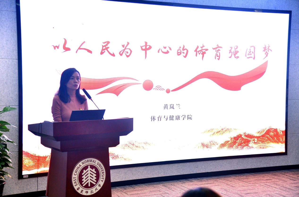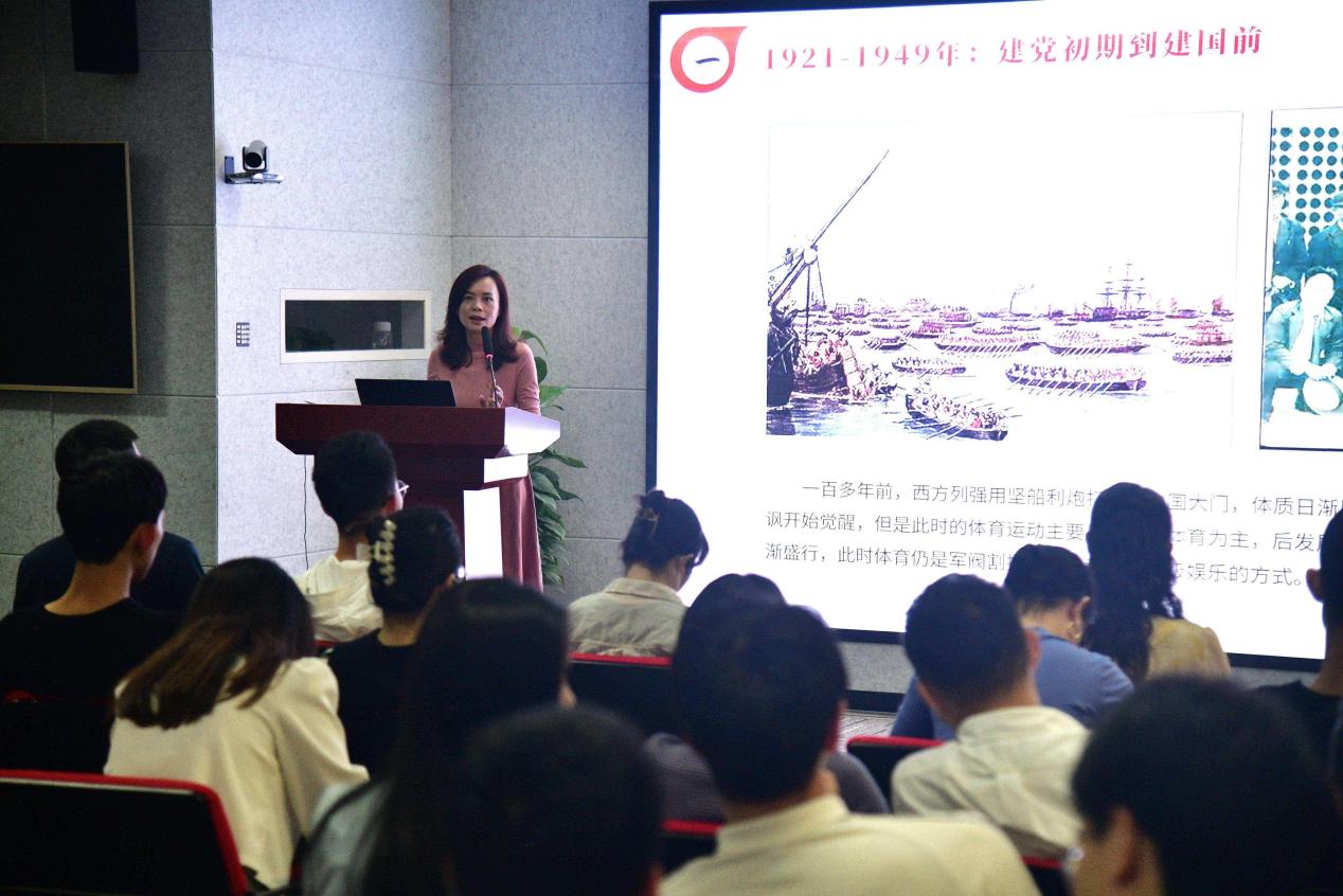 立足主题教育视角,看中国体育百年发展史。黄岚兰结合自身阅读书籍的体会,向大家讲述了百年来中国体育的发展变迁,以及历届国家领导人对体育事业的关心关怀,以及为促进体育事业发展而颁布的一系列制度、方案和措施等。黄岚兰通过第一套广播体操公布、中华人民共和国第一届运动会开幕等事例,生动地让大家感受到了,体育不仅仅是一种竞技,还是一种文化、一种思想和一种境界,从体育救国到为国争光,从体育大国到体育强国,体育走进千家万户,成为人民生活的基本诉求和幸福来源,更成为了“讲好中国故事、传播中华文化”的载体。