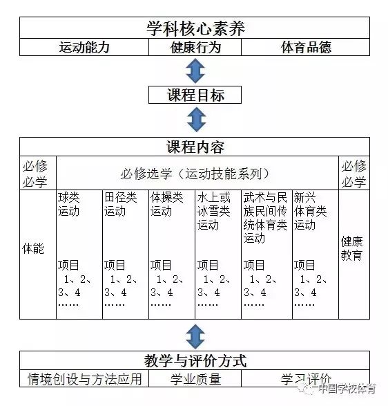 普通高中体育与健康课程结构是从学科育人的角度来整体构建的,即以学科核心素养引领课程目标、课程内容、教学与评价方式(情境创设与方法应用、学业质量、学习评价)等。反过来,课程目标、课程内容、教学与评价方式等设置也是为了促进学科核心素养的形成,是一个从哪里来到哪里去的课程结构设计。